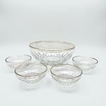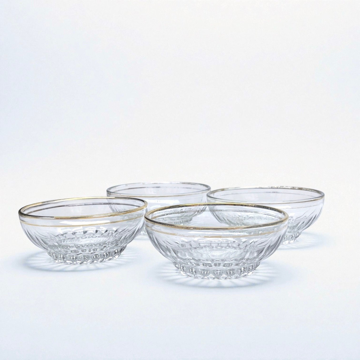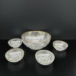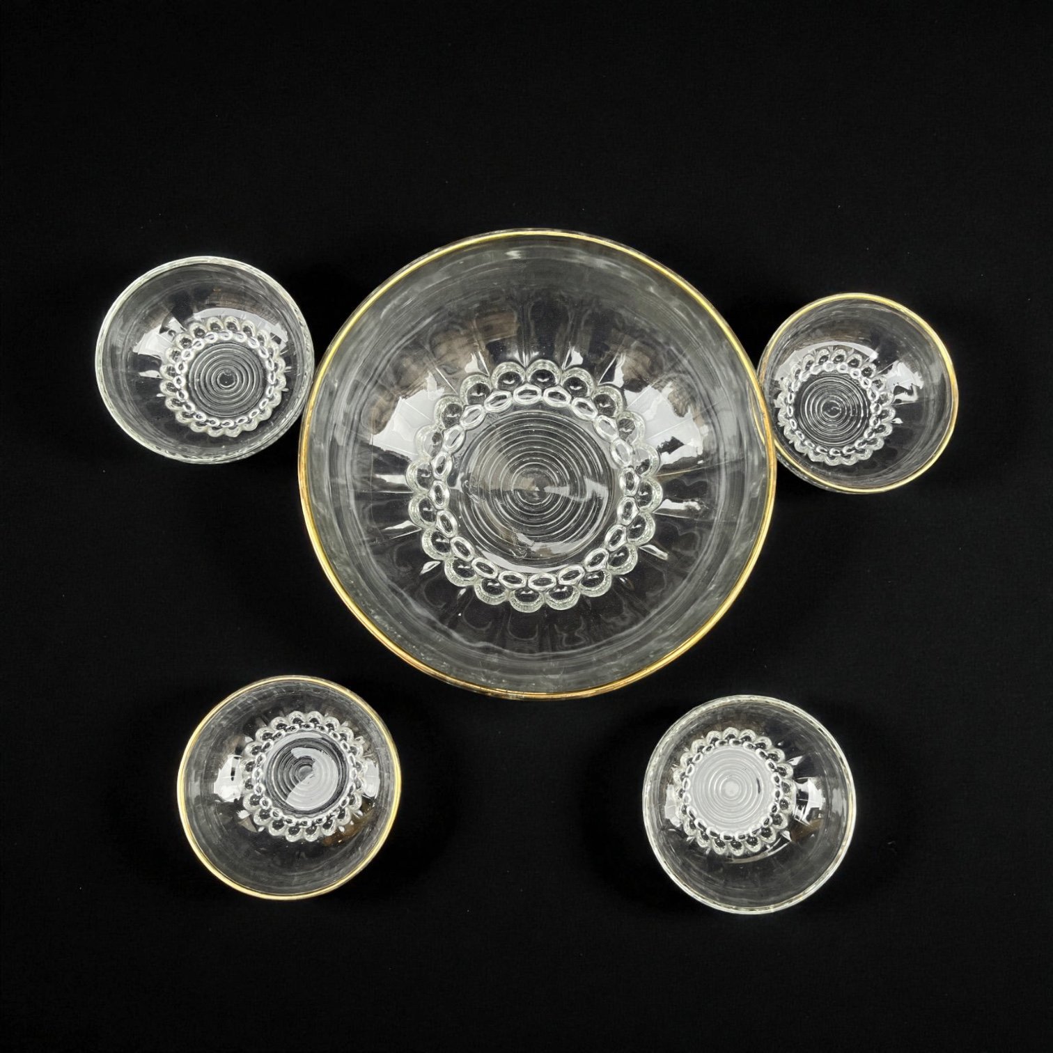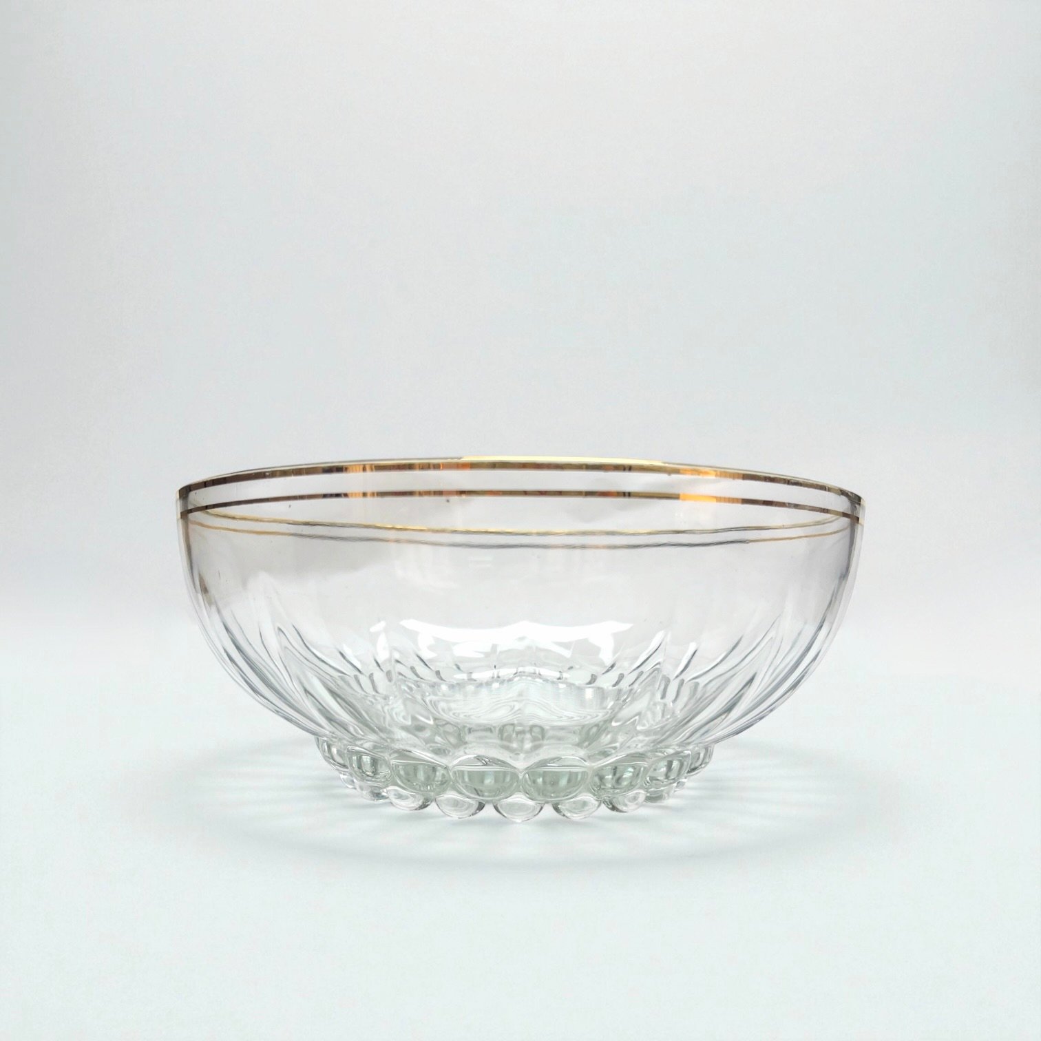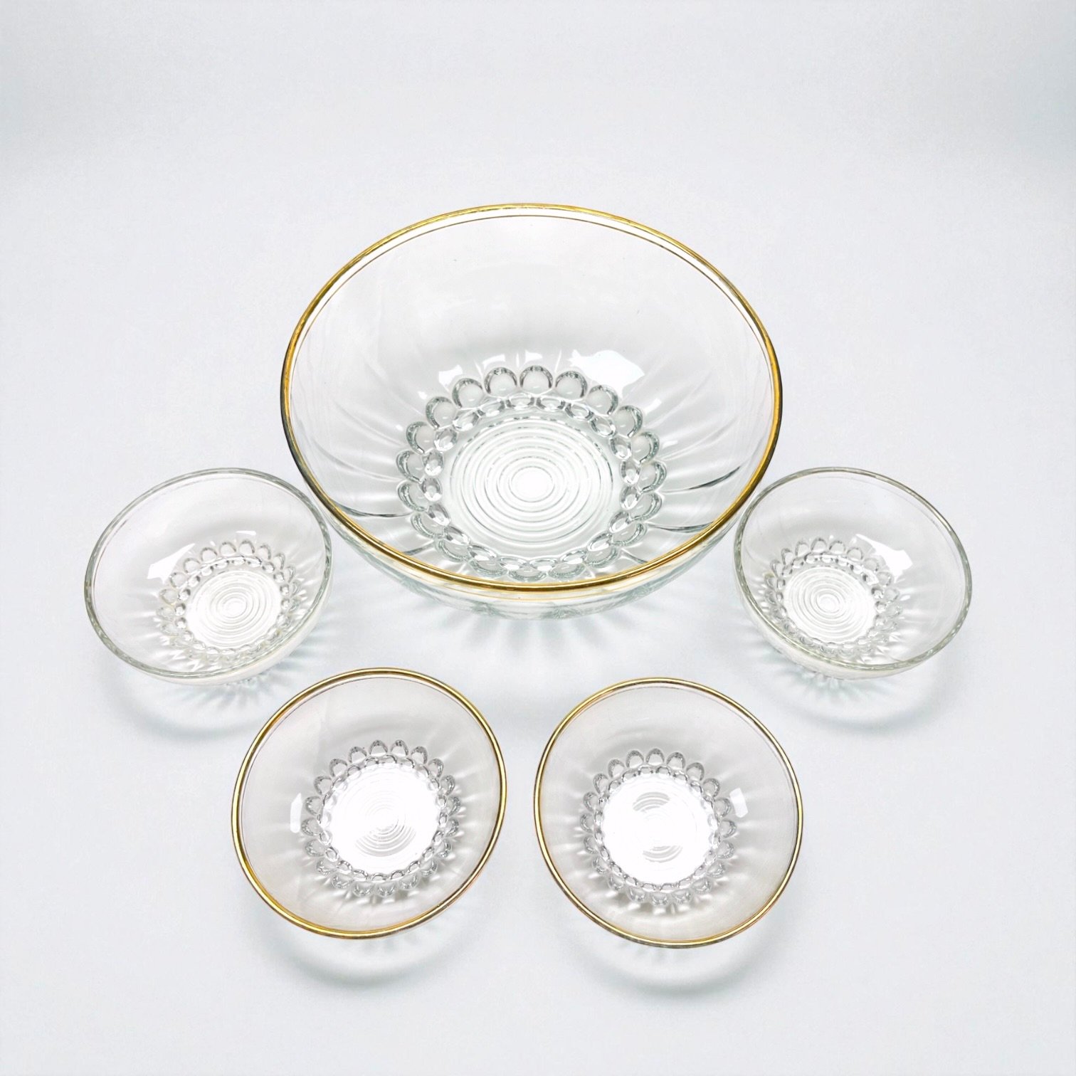 Ensemble composé d’un grand saladier et de quatre coupelles assorties, en verre transparent moulé. Chaque pièce présente un décor en relief formé de petites boules à la base et un filet doré sur le bord. Les coupelles reprennent la même forme et le même motif que le saladier, dans des proportions plus petites — parfaites pour servir les portions individuelles de salade de fruits.