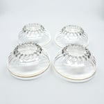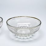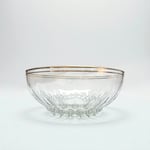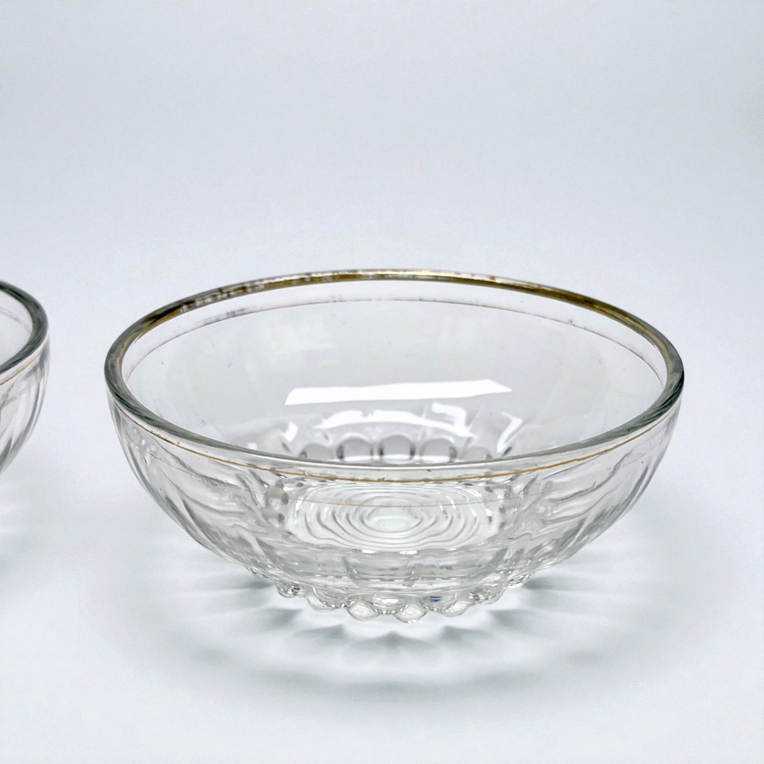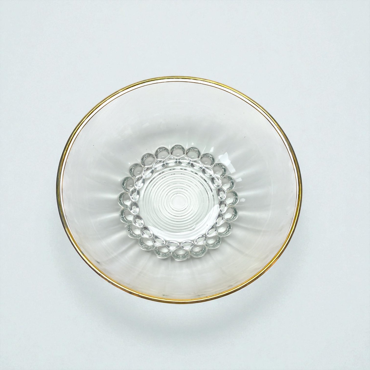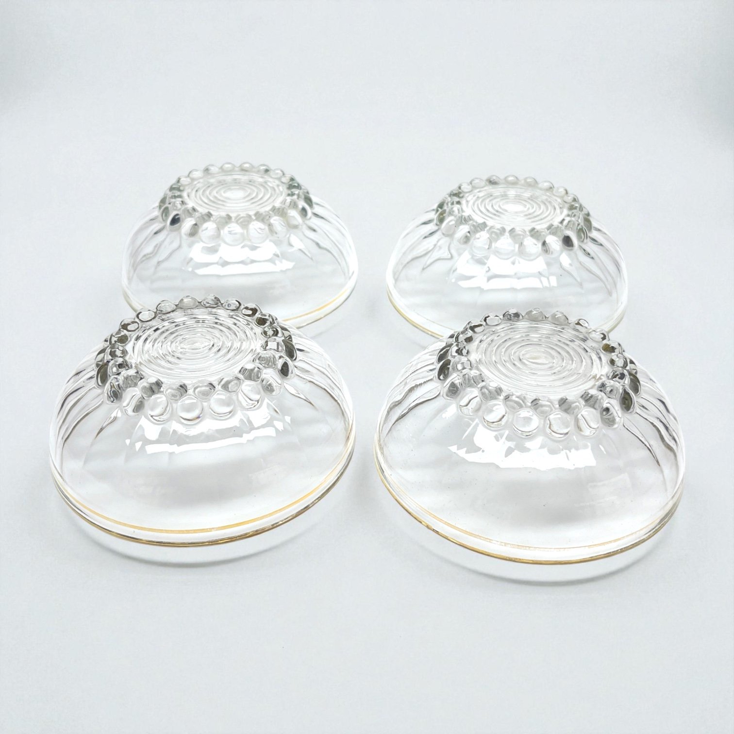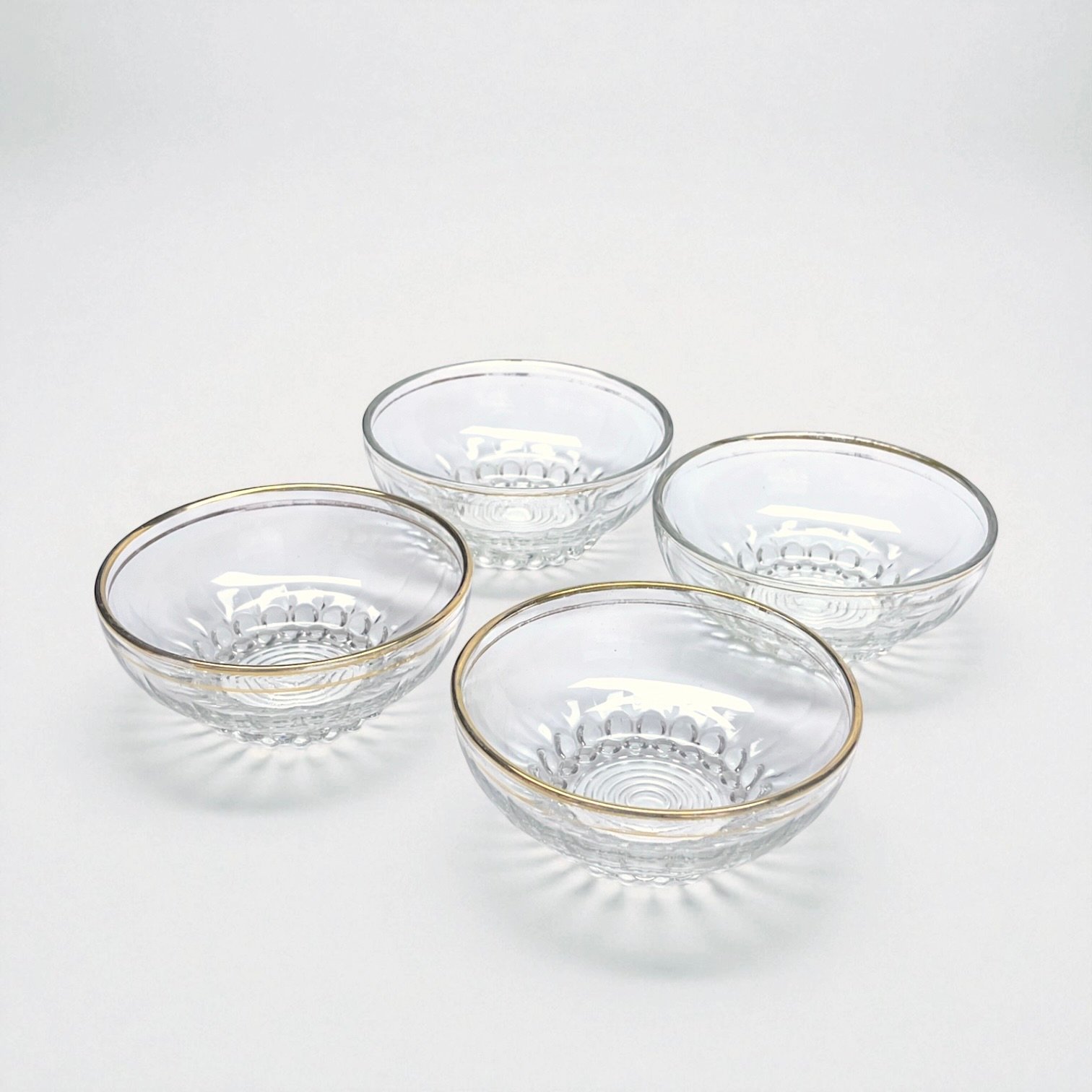 Ensemble composé d’un grand saladier et de quatre coupelles assorties, en verre transparent moulé. Chaque pièce présente un décor en relief formé de petites boules à la base et un filet doré sur le bord. Les coupelles reprennent la même forme et le même motif que le saladier, dans des proportions plus petites — parfaites pour servir les portions individuelles de salade de fruits.