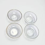 Ensemble composé d’un grand saladier et de quatre coupelles assorties, en verre transparent moulé.