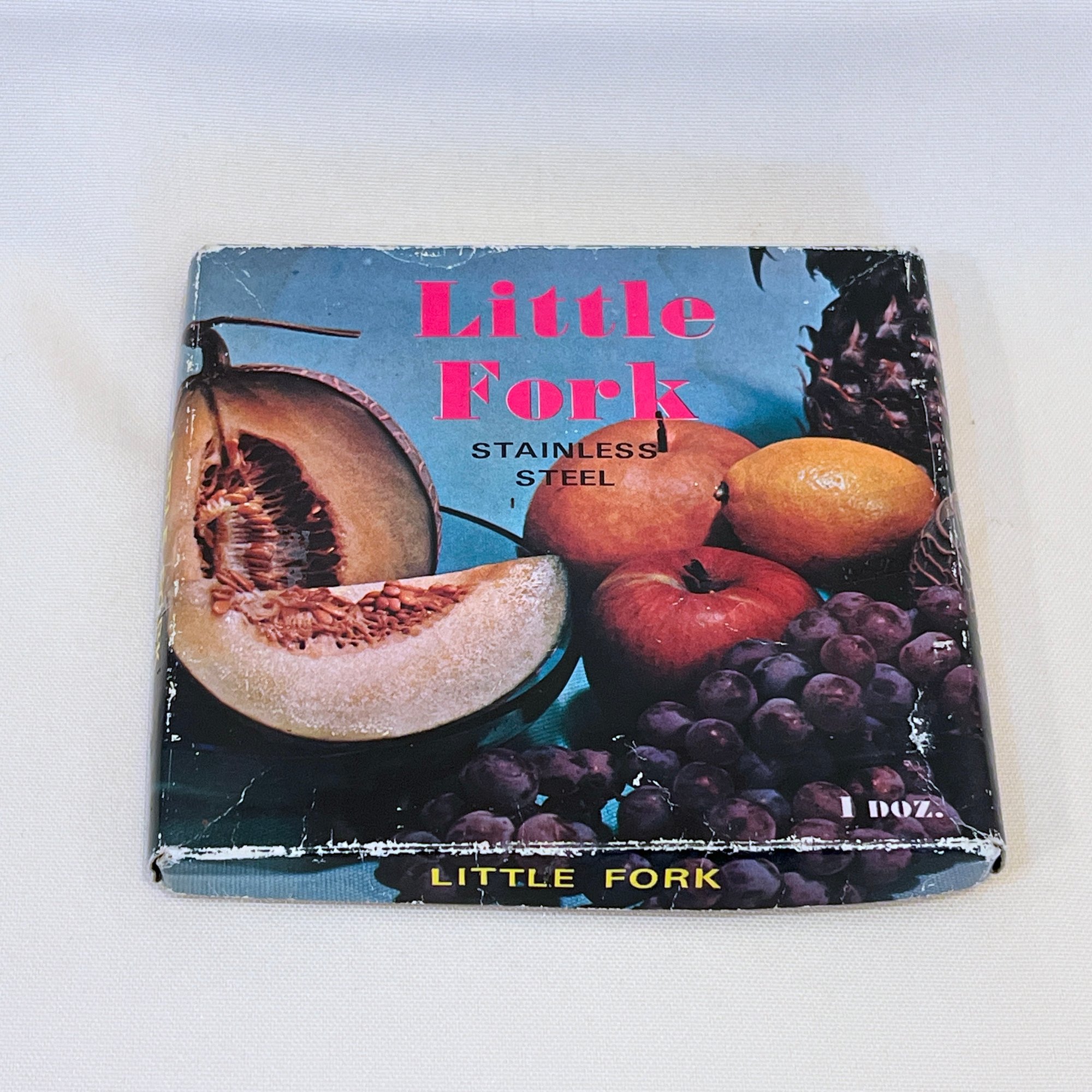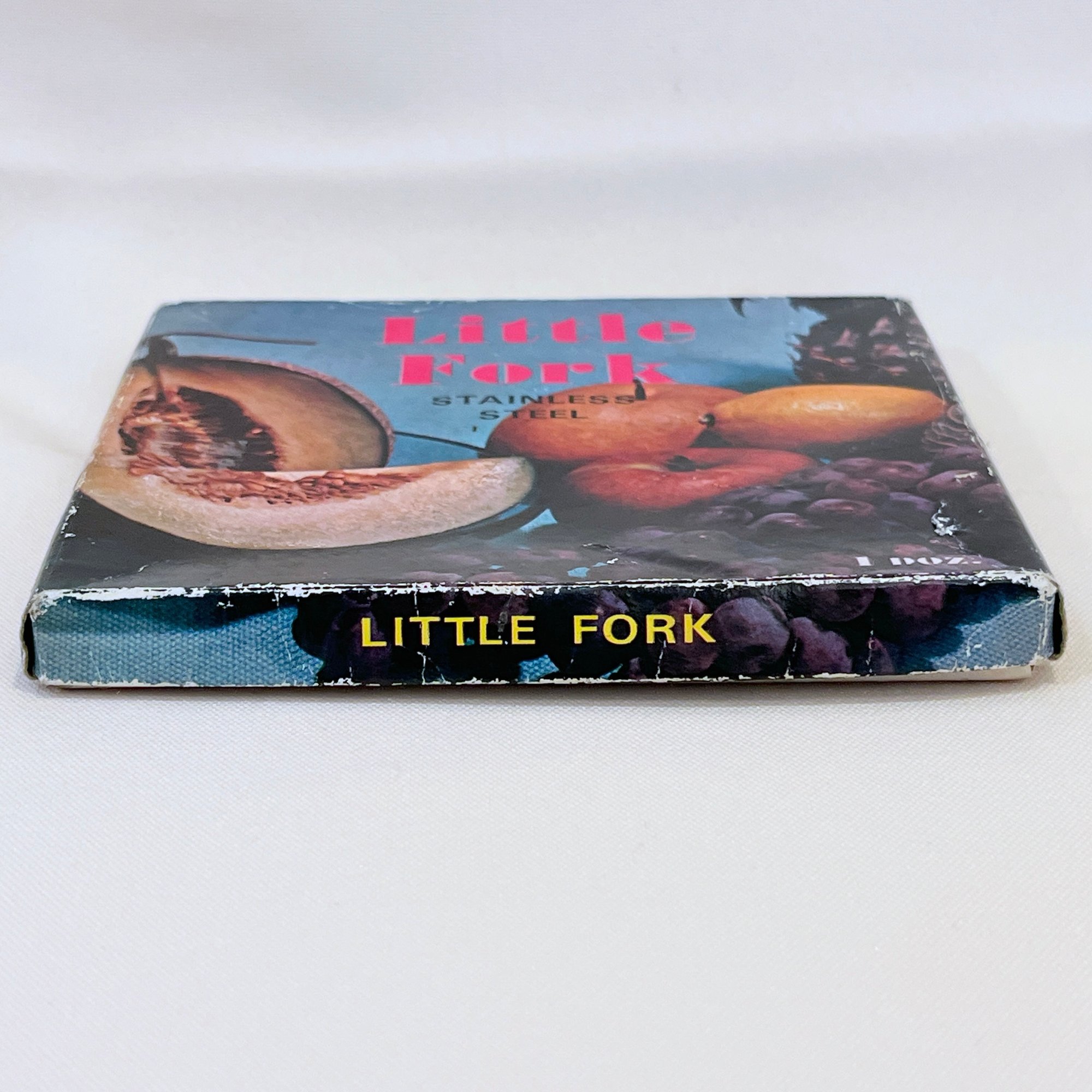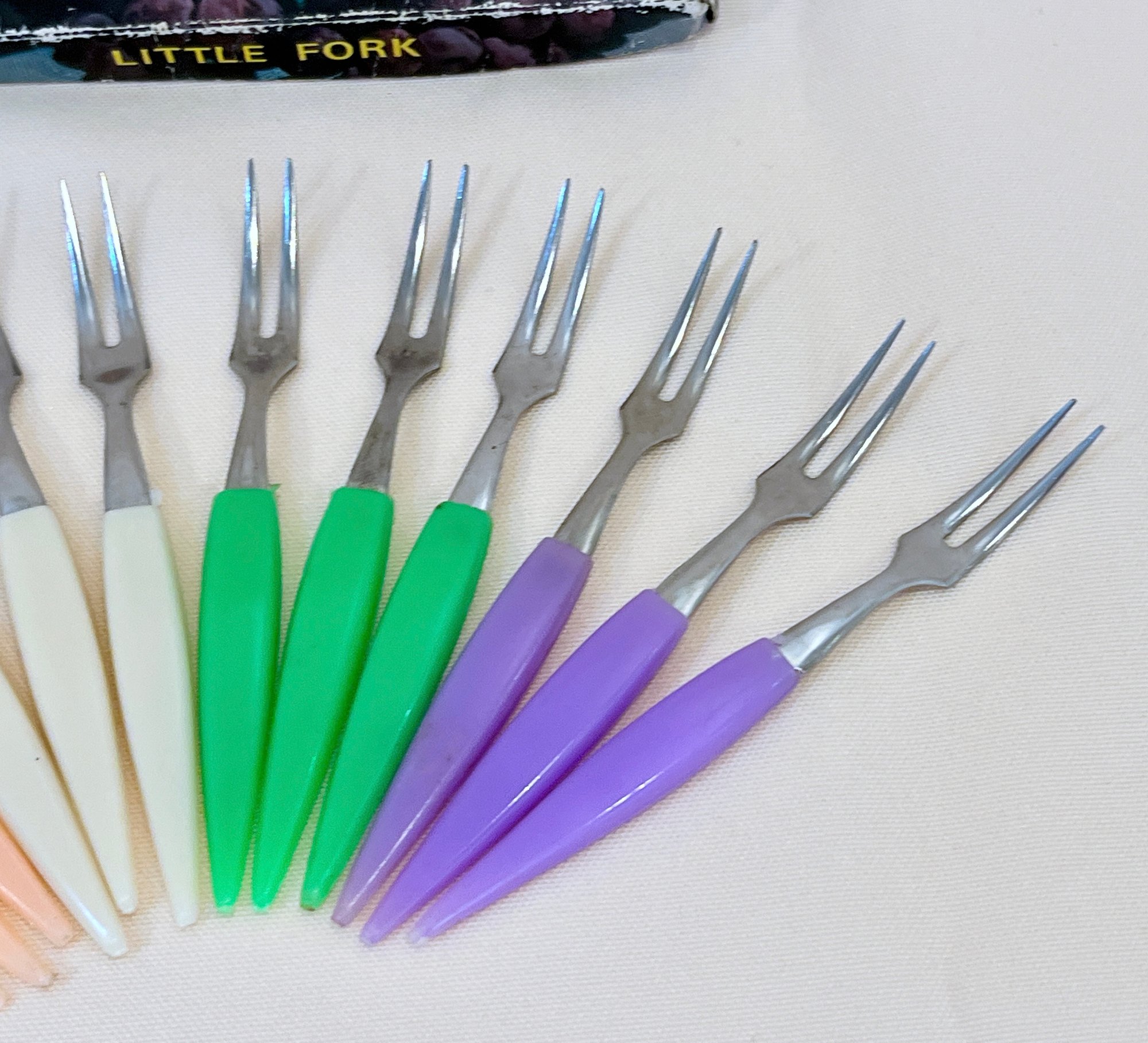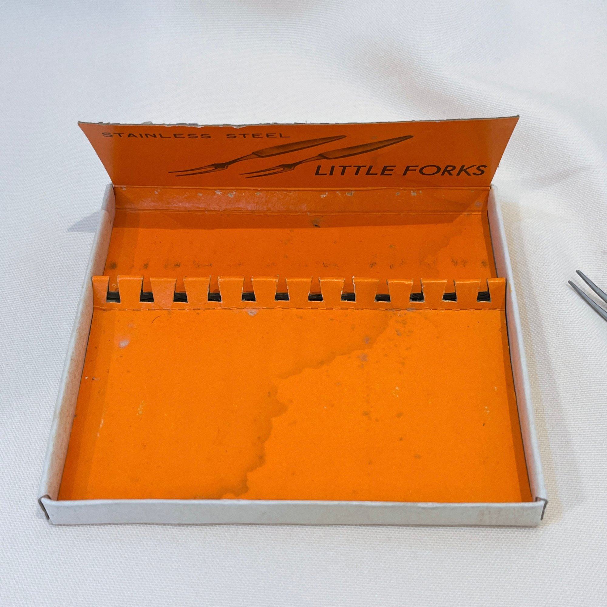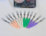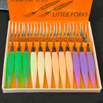 Coffret vintage des années 60/70 composé de douze petites piques à apéritif en acier inoxydable, avec manches en plastique coloré.