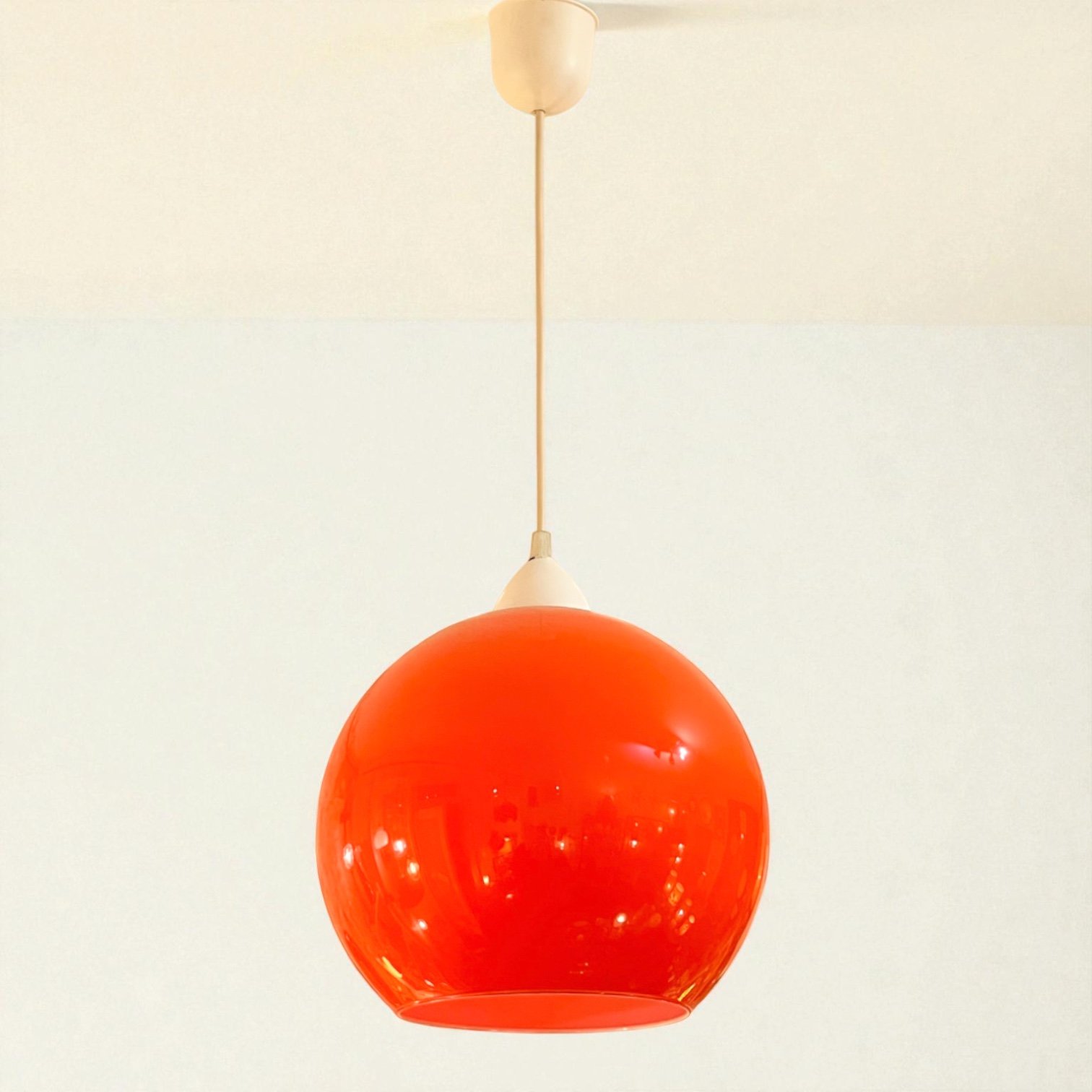 Suspension vintage en verre opaline orange, blanc à l’intérieur, typique du design Space Age des années 60 / 70.