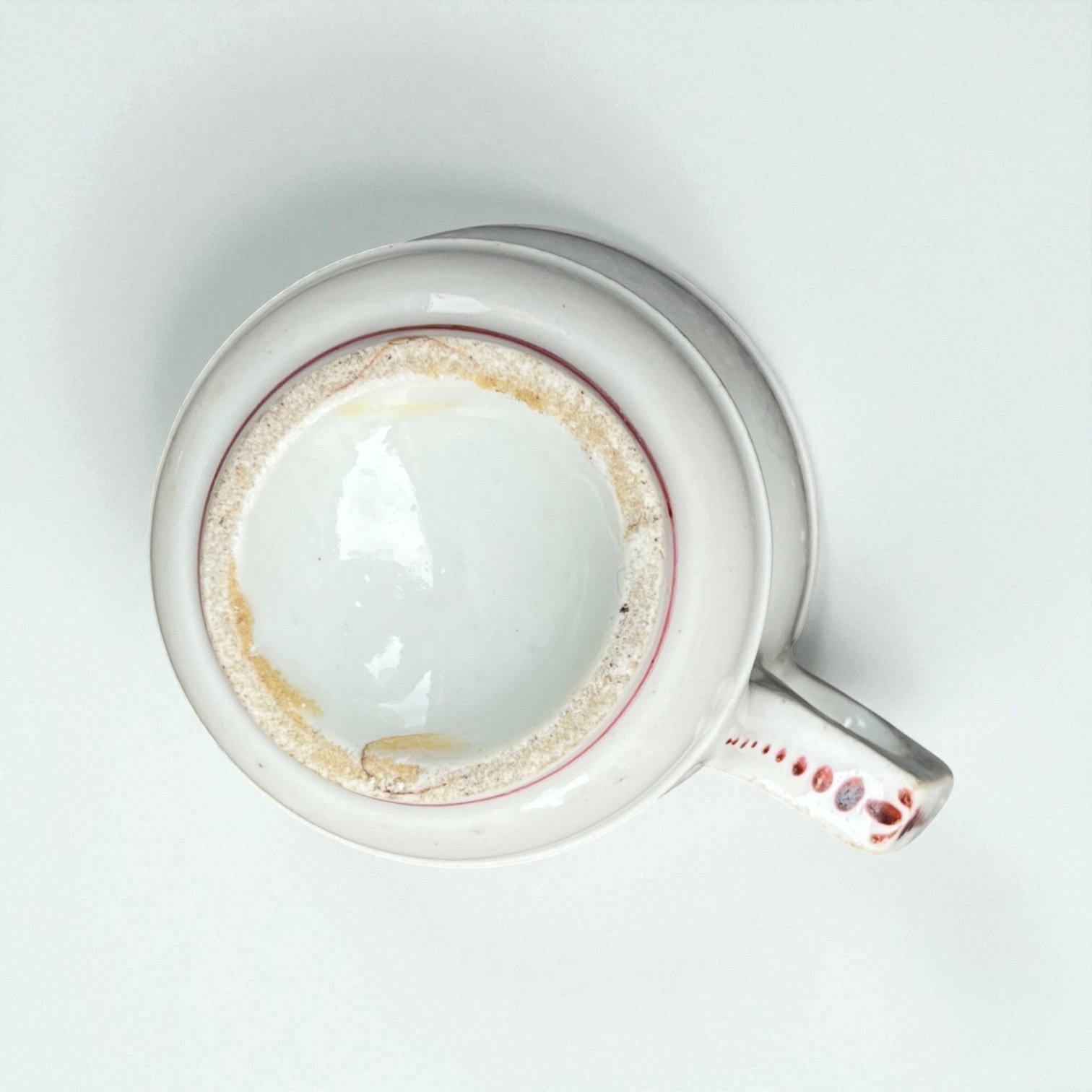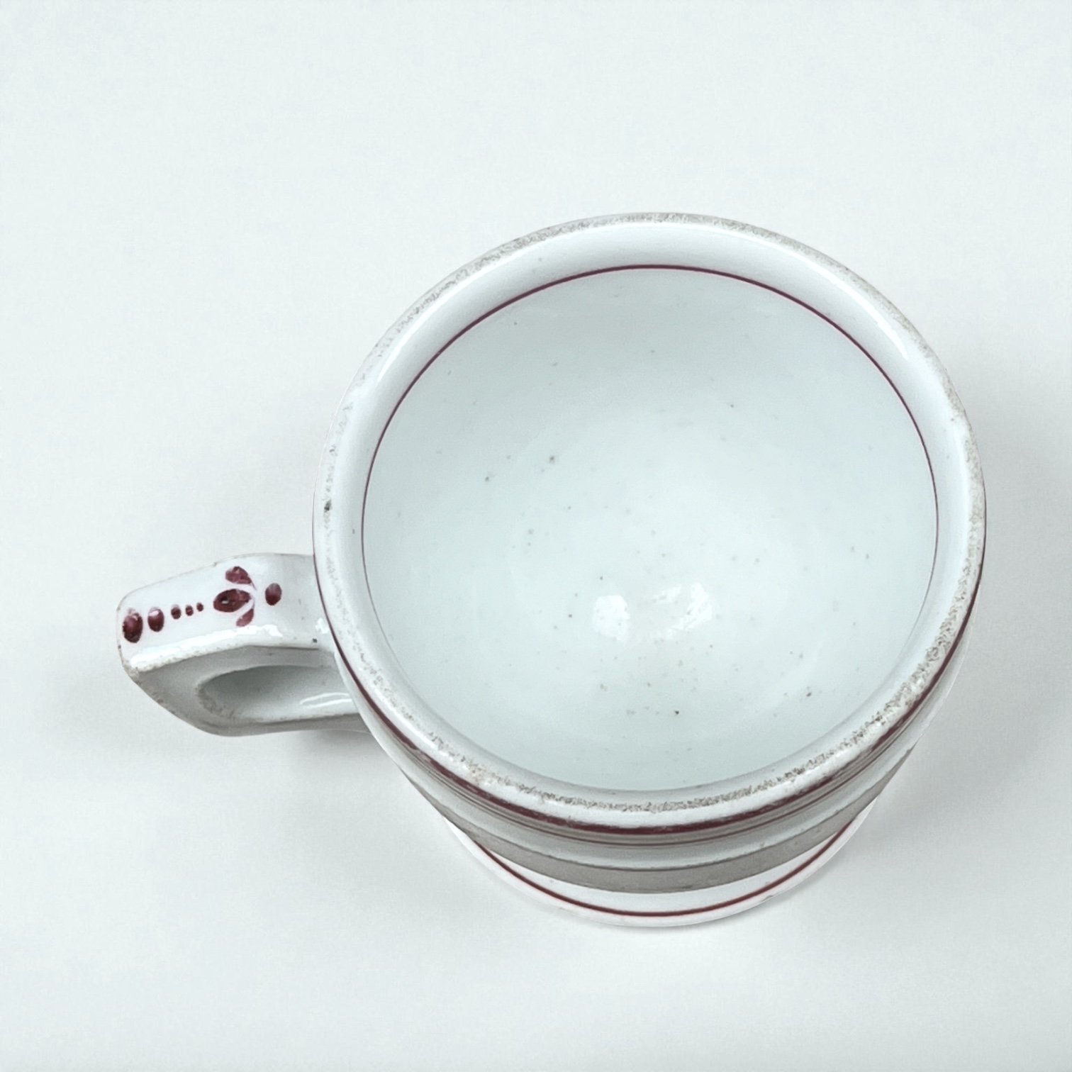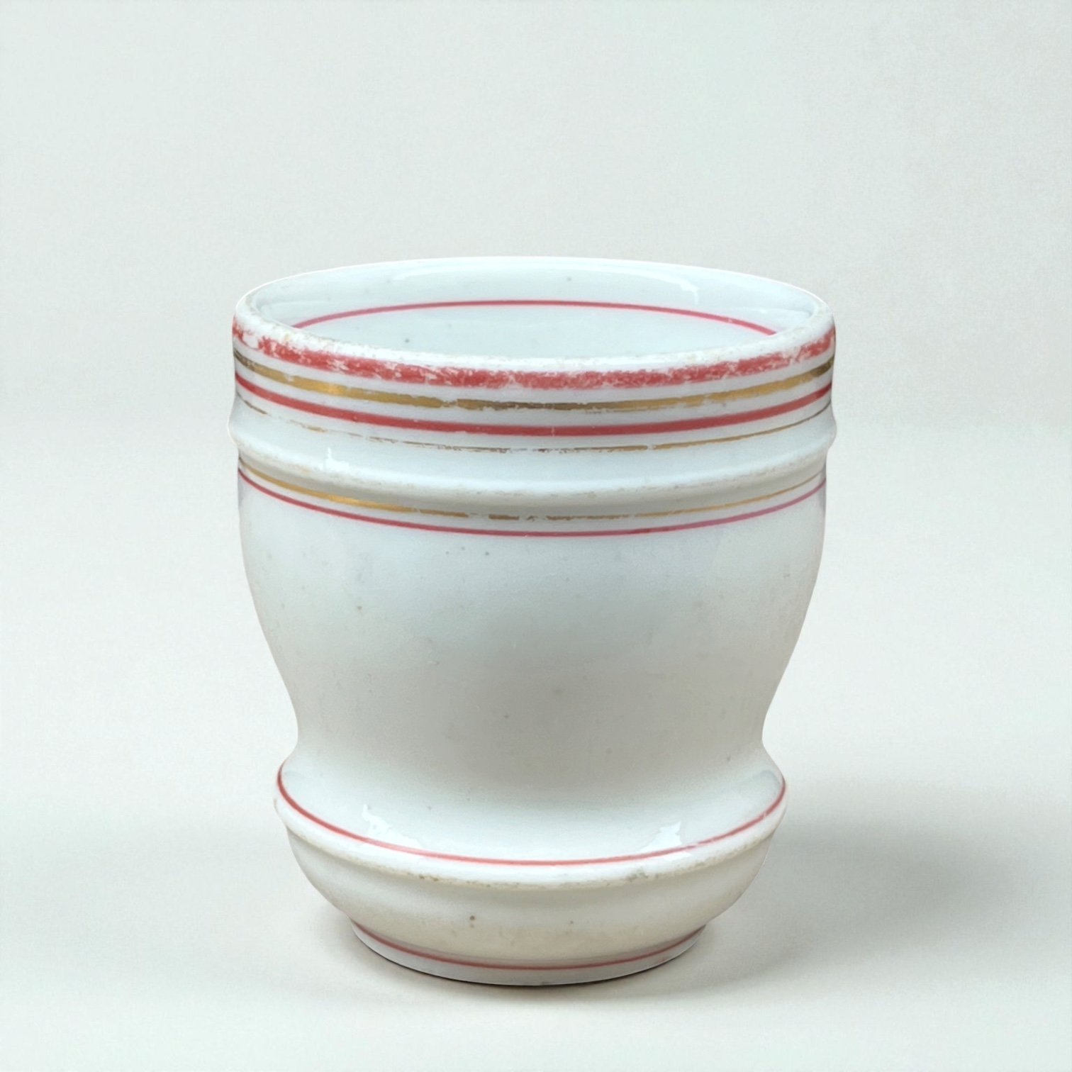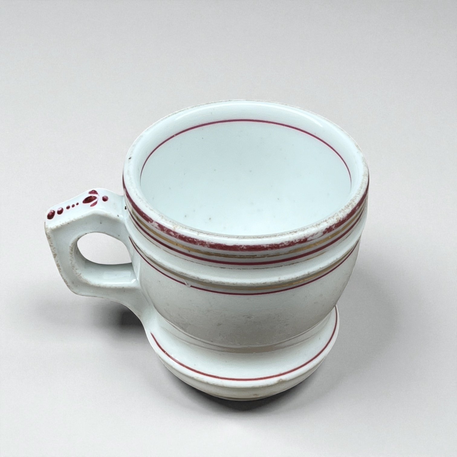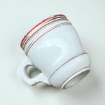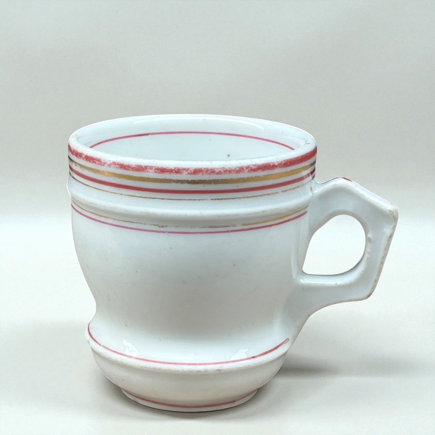 Charmante tasse à café de type brûlot, en céramique blanche décorée de fins liserés rouges et dorés. Ce modèle, reconnaissable à sa forme galbée et à son anse typique, était couramment utilisé dans les cafés et bistrots de la fin du XIXᵉ et du début du XXᵉ siècle.