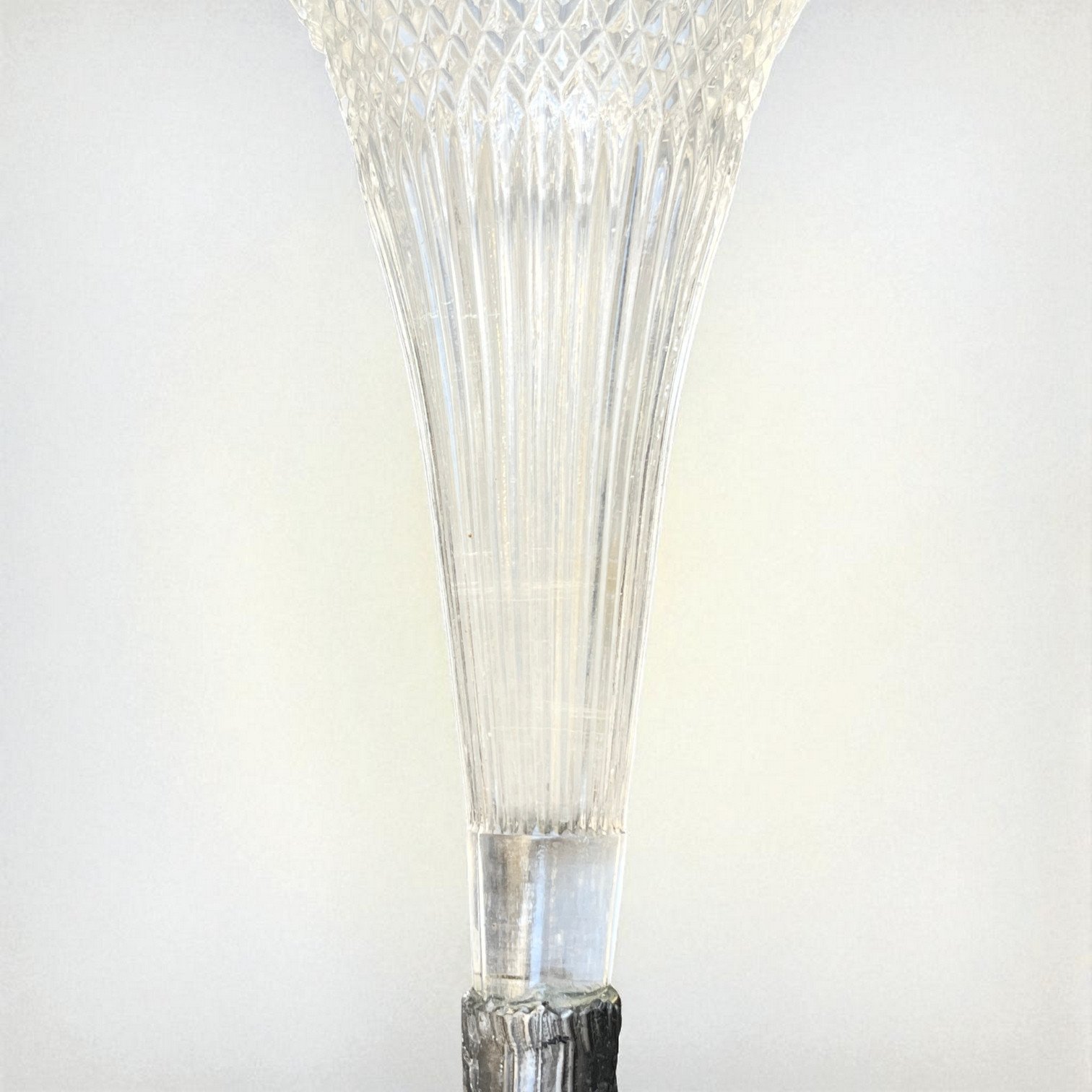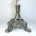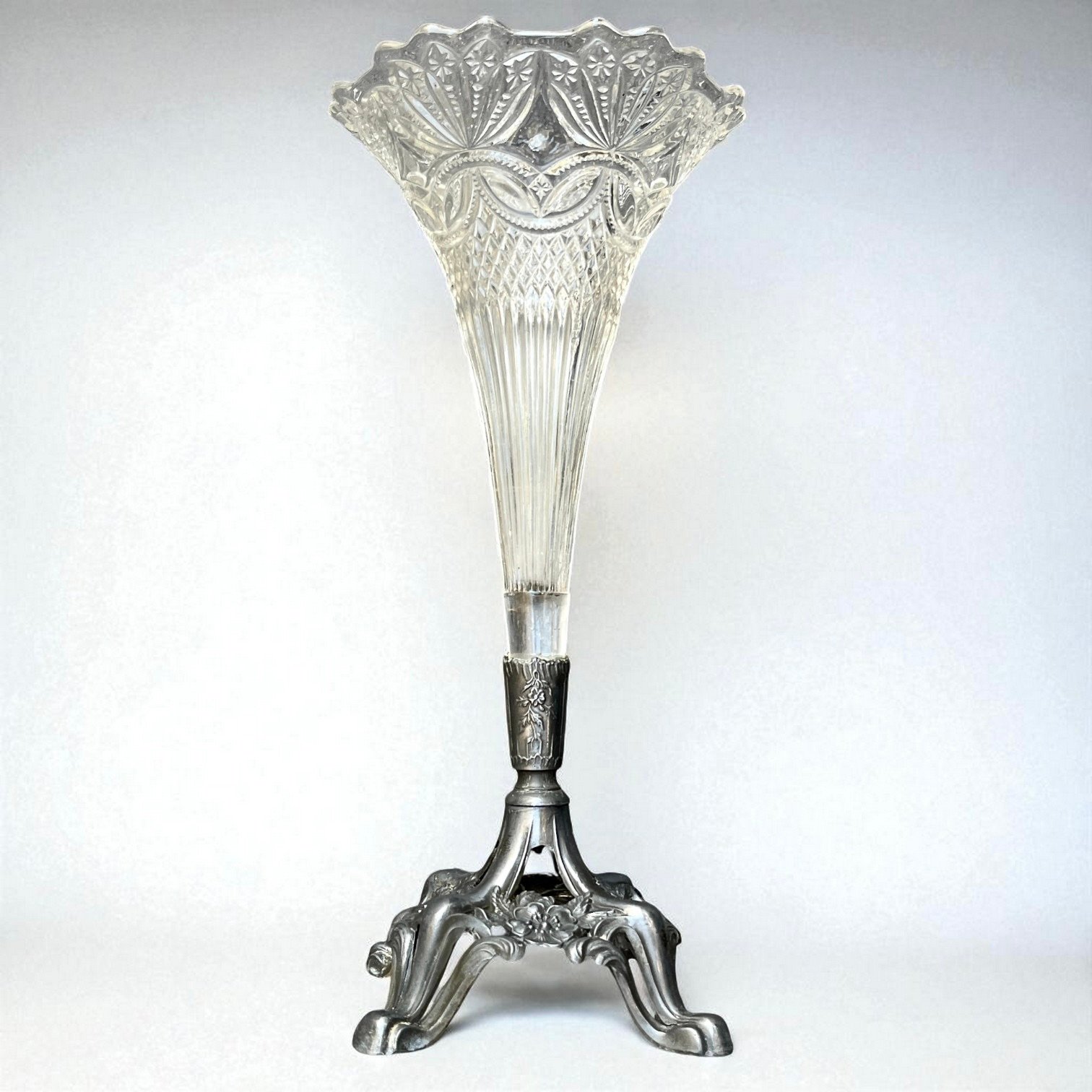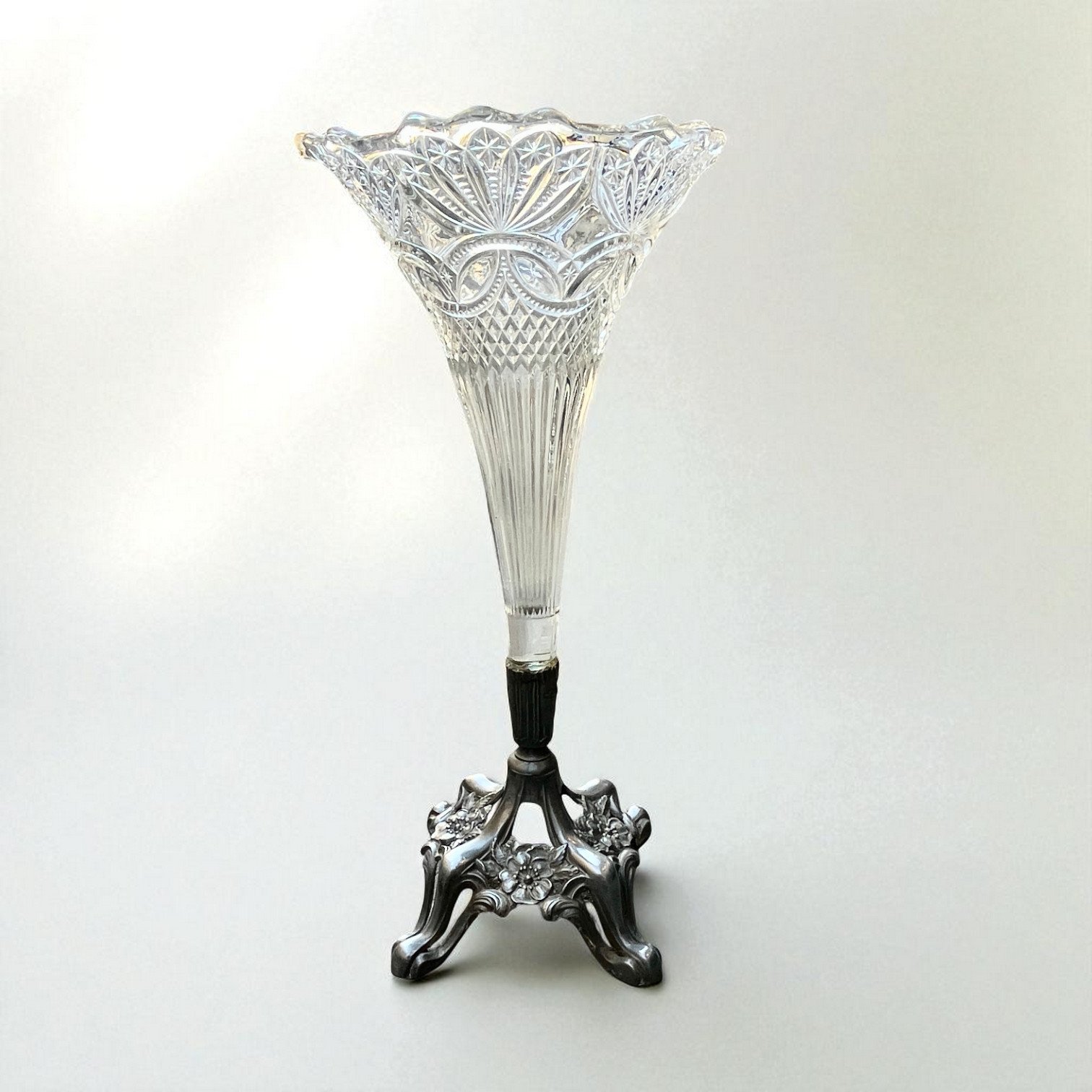 Élégant vase cornet Art Nouveau en verre moulé motif floral et pied en métal étain orné de fleurs et d'arabesques.