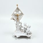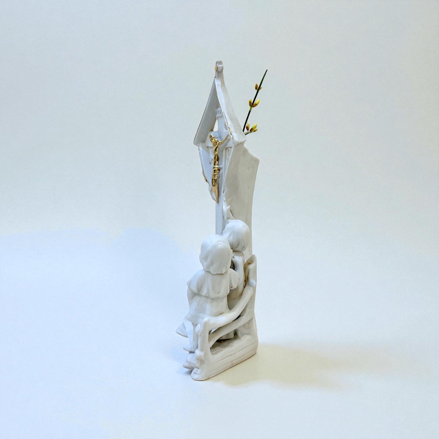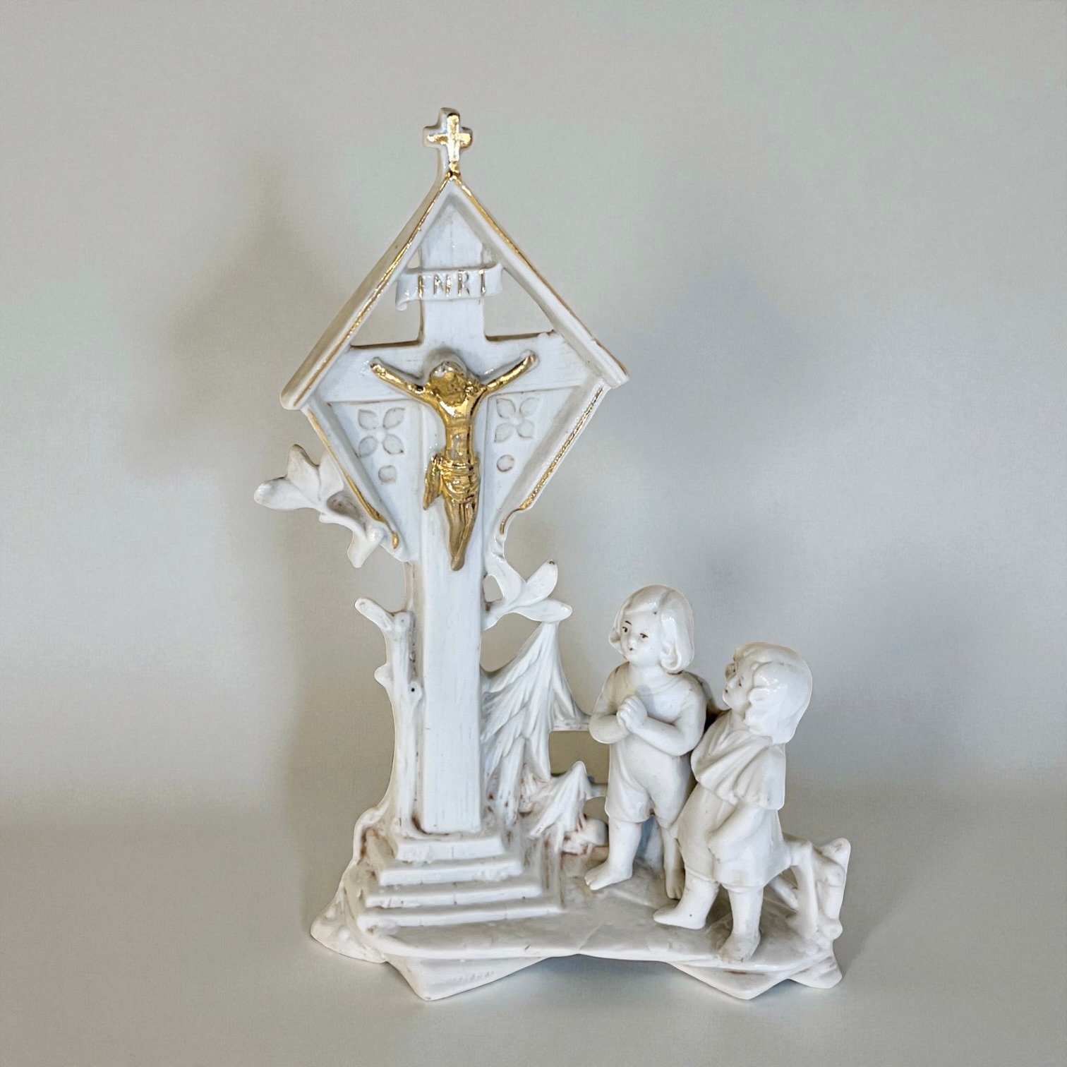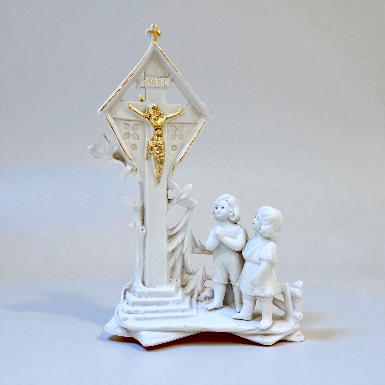 Vase religieux ancien en porcelaine blanche – Crucifix doré & enfants en prière - fin XIXe