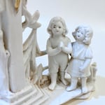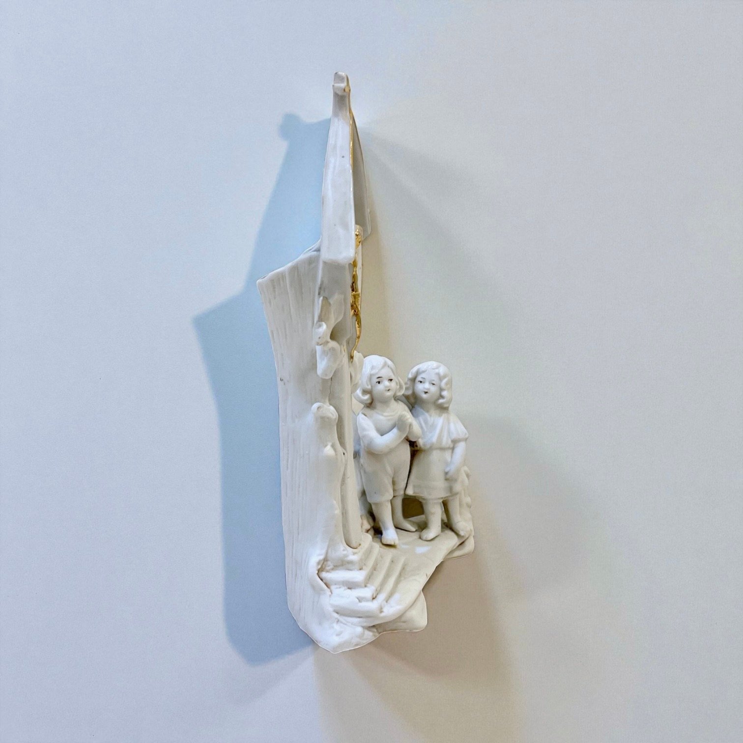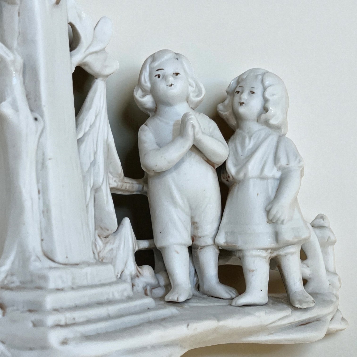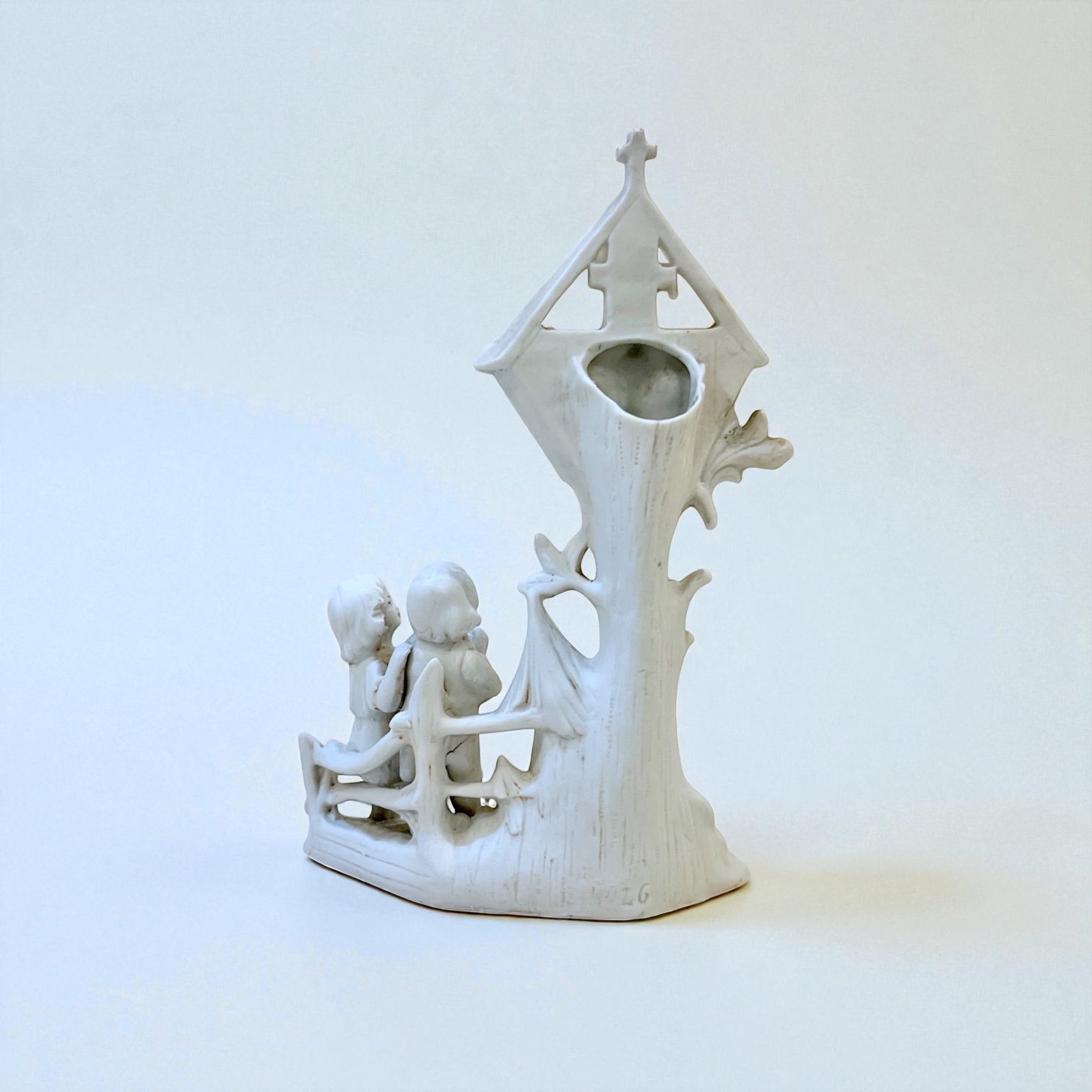 Vase religieux ancien en porcelaine blanche – Crucifix doré & enfants en prière - fin XIXe