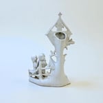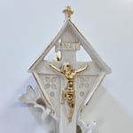 Très joli vase religieux en porcelaine représentant le Christ en croix doré sous abri triangulaire portant l’inscription INRI.