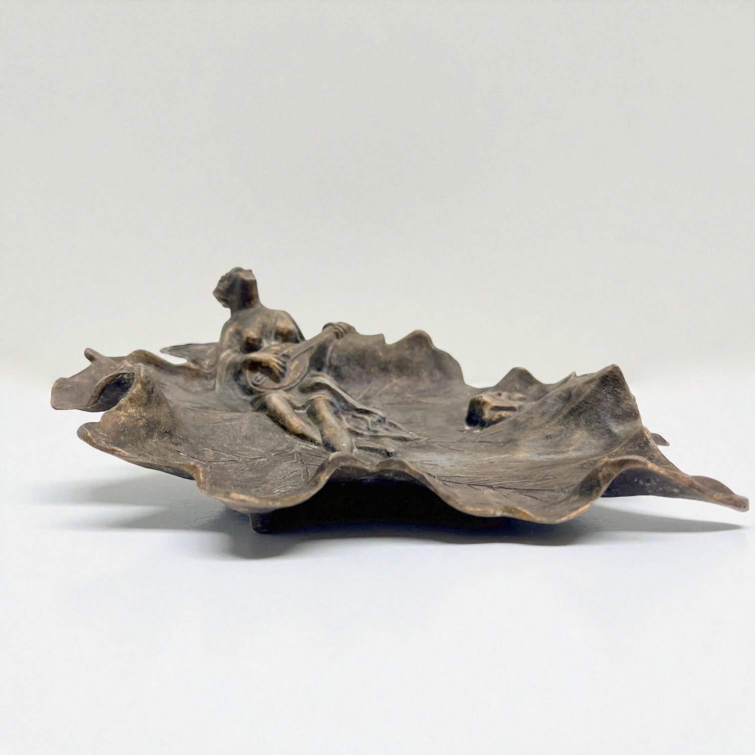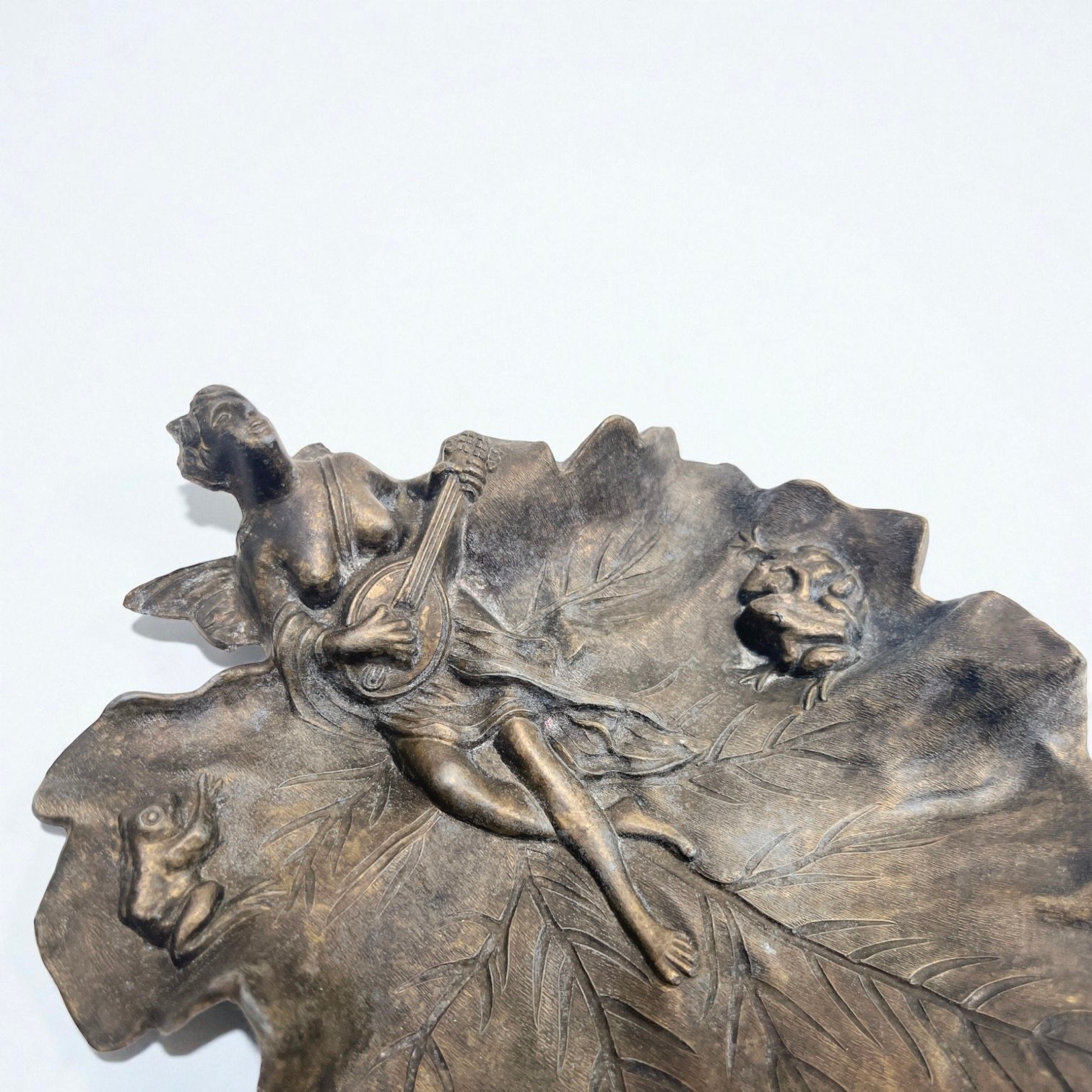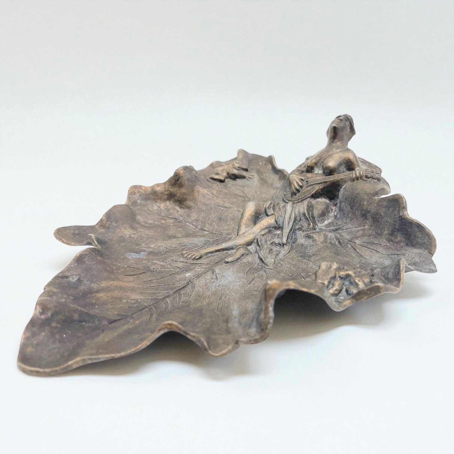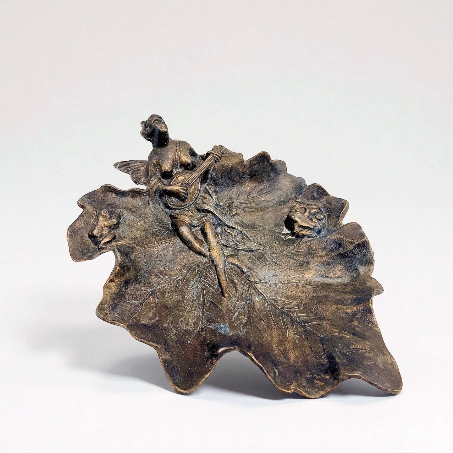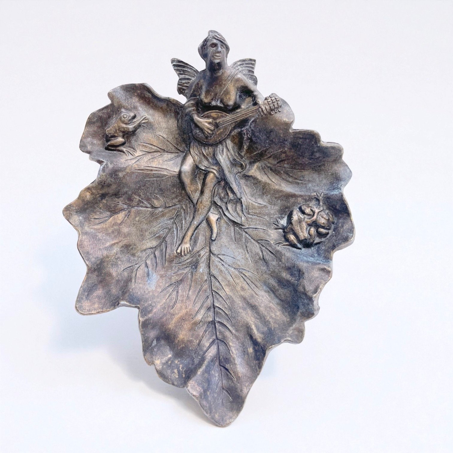 Vide-poche ancien style Art Nouveau en métal bronze – Fée musicienne et grenouilles
