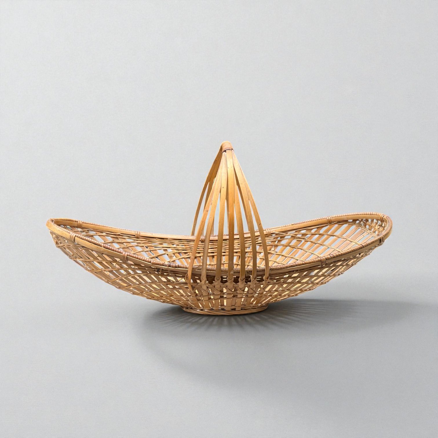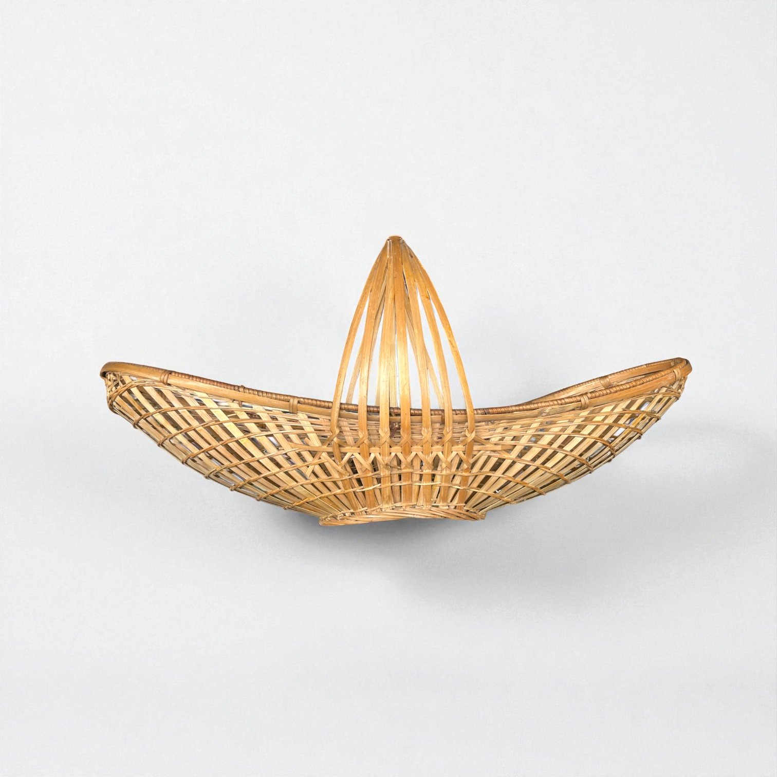 Charmant grand panier français en osier de forme ovale, à anse haute et fine, réalisé dans un tressage d'osier ajouré qui lui confère légèreté et élégance.